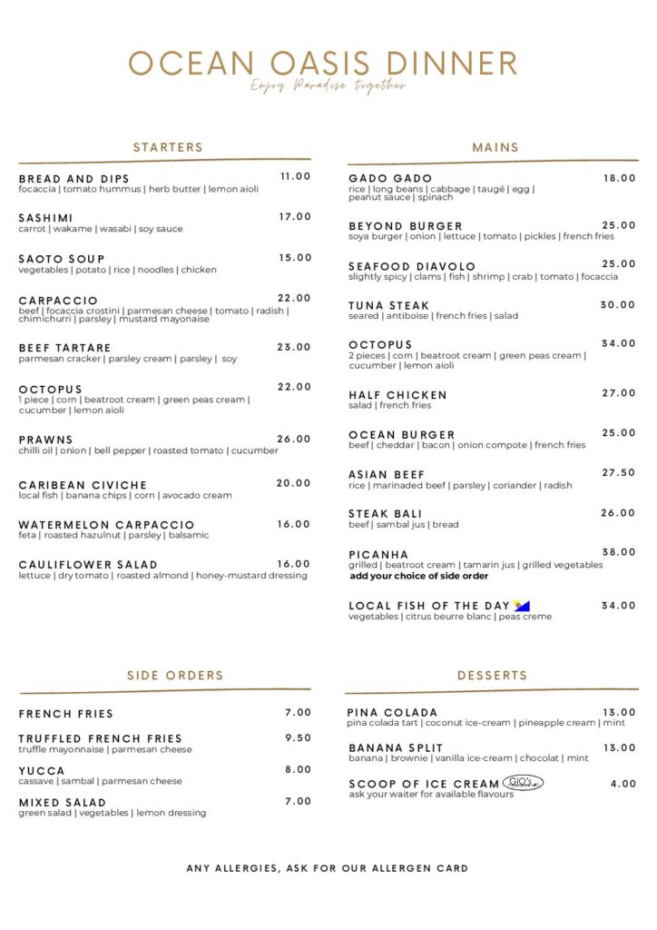 Onze kaart biedt smaakvolle gerechten met een frisse twist, vers gevangen lokale vis of vegetarische keuze naar wens. Uniek zijn de boven de Josper houtskool gegrilde US Premium steaks of de bereidingen van de vers gevangen vis. Al het patisserie wordt in onze eigen keuken bereid en zorgt voor een betoverende, laatste indruk.